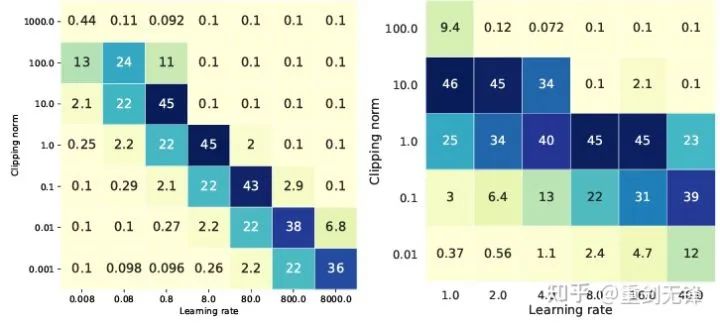 其实,这意味着 DP 训练减少了一个数量级的调参工作:假设学习率和 R 各调 5 个值(如上图) ,那就要测 25 种组合才能找到最优超参数。现在只需要调学习率 5 种可能就好,调参效率提高了数倍,这是对业界来说极有价值的痛点问题。