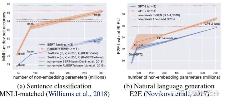 1. 在 NLP 任务中,DP 模型的 accuracy 非常高,鼓励了 privacy 在语言模型的应用。(与之相对的是 CV 中 DP 会产生非常大的 accuracy 恶化,比如 CIFAR10 目前 DP 限制下不用预训练只有 80% accuracy,而不考虑 DP 可以轻松达到 95%;ImageNet 当时最好的 DP accuracy 不到 50%。)