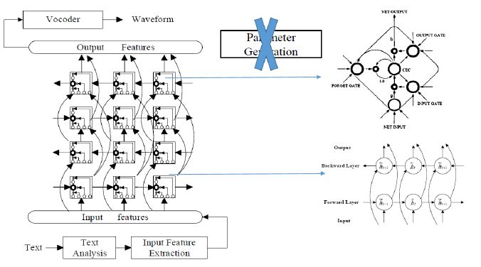 深度双向长短时记忆网络(DBLSTM-RNN):优势在于能完全做到端到端,较之前的网络跳过了参数生成算法。语音合成需要对文本做很多处理,如分析短语边界、词性、拼音等,通常使用贝叶斯决策、条件随机场、最大熵等方法,这些都可以用深度神经网络代替。声学层再做一个深度神经网络,将两个网络嫁接即可,不需要HMM,输入文本,经神经网络输出语音参数,再经声码器就可得到很好的声音。