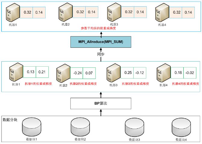 同步随机梯度下降(MPI):多进程训练,每个进程训练结束后将参数在服务器上平均后对所有进程重新同步,其他机器在这个新的参数基础上训练。该方法实现难度适中,模型参数在内存中进行同步和操作,训练速度快,精度损失较小。但一旦某台机器模型训练失败,所有机器需从头开始训练。