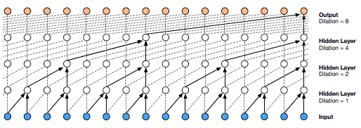 谷歌WaveNet:主要思想如下,语音的波形就是一个个采样点,每个采样点都受前面一系列采样点约束,存在条件概率密度函数,波形的联合概率可用条件概率分布的乘积来建模。