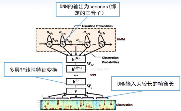 目前提到的深度神经网络依然和HMM进行了结合,仅仅把GMM替代了。它的训练过程还要依赖于传统的GMM-HMM的强制对齐信息,即利用GMM-HMM对每帧语音打一个标签,再利用这种有标签的数据训练深度神经网络,但这种方式依然是目前性能最好的方法之一。