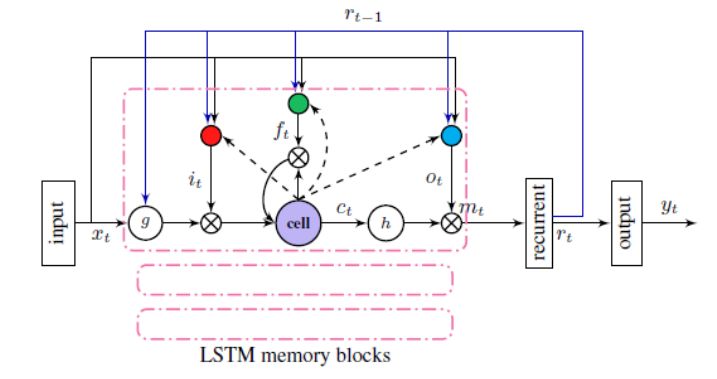 深度循环神经网络-隐马尔科夫模型(RNN-HMM):如上所述,单纯用深层神经网络没有历史信息来辅助当前任务,所以提出RNN-HMM模型。RNN增加了时间的反馈,能够有效的利用时间的历史信息,将历史信息持久化,在很多任务上性能表现优于DNN,尤其是针对语音,因为语音具有很强的时序概念。但RNN随层数的增加会出现梯度爆炸或梯度消失,难以训练。也有人将长短时记忆模型LSTM融入RNN,LSTM采用一些控制门(输入门、遗忘门和输出门)来减少梯度累计的长度,一定程度上解决了RNN训练时的梯度消失和扩散的问题。RNN是迄今为止语音识别最好的模型之一,它的变体LSTM和BLSTM的性能都是相对最好的。