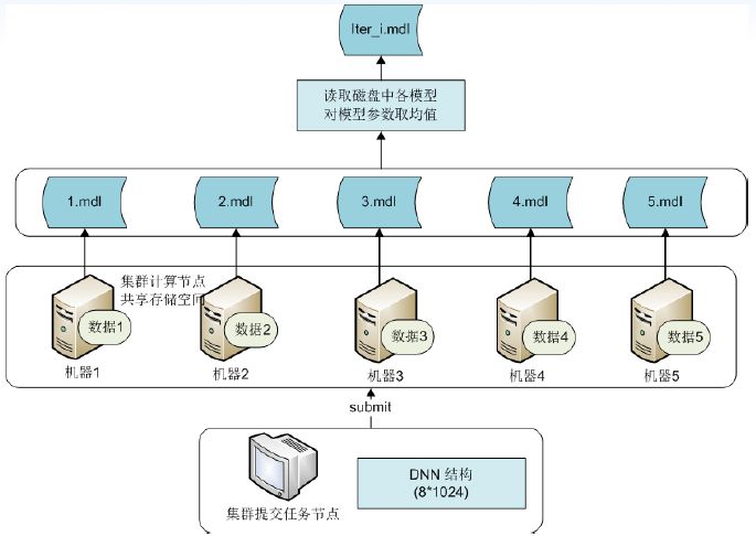 多机共享存储:每个机器单独训练模型,将训练参数取均值。优点是实现简单,各个模型互不干扰,某个机器模型训练失败只需单独重新训练,缺点是频繁存储和读取磁盘文件,占用大量I/O带宽,训练速度慢。