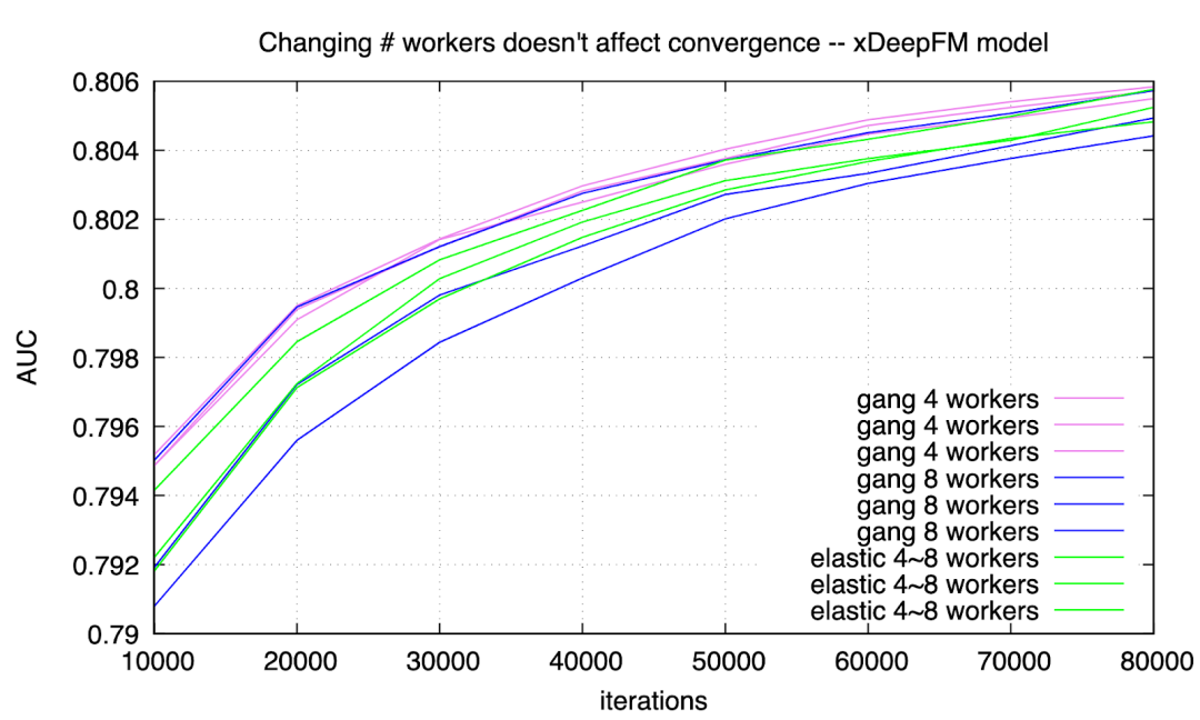 有用户担心训练过程中 worker 的数量发生变化,会导致不收敛。实际情况下从未发生这类问题。用 ElasticDL 和用 gang scheduling 分别训练 Wide & Deep model 和 xDeepFM model, 收敛曲线如下: