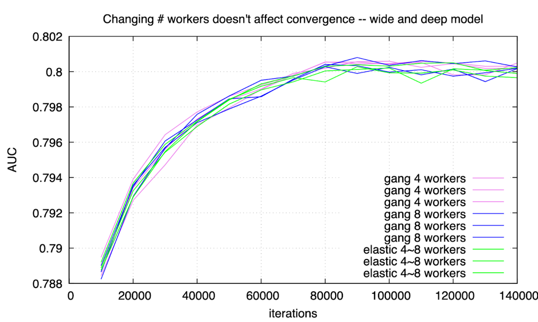 可以看到,采用 gang scheduling 持续用 4 个或者 8 个 workers,和用 ElasticDL 并且 worker 数量在 4 到 8 之间变化,得到的收敛曲线很难分辨。差别在自然误差范围之内。
