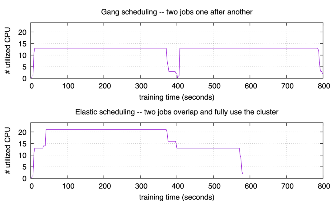 考虑两个 AI 训练作业需要的资源总和略超过集群的情况:如果没有 elastic scheduling,则两个作业 顺序执行。第二个作业的发起人需要等很久 —— 用户体验不好。并且任何时刻只有一个作业在运行 —— 集群资源用不满。而如果有 elastic scheduling,则两个作业并发执行,虽然后启动的作业拿不到期待的全部资源,但是也马上就开始执行了 —— 用户体验好,而且因为作业并发集群被用满。