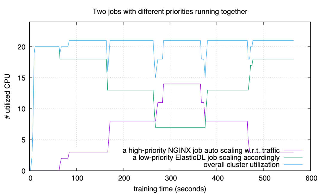图中紫色曲线是 NGINX 服务使用的 CPU 数量,随用户请求数量变化。绿色曲线是 ElasticDL 训练作业使用的 CPU 数量,随 NGINX 的资源需求自动变化。蓝色曲线是集群的总体资源利用率 —— 保持在 90% 以上。