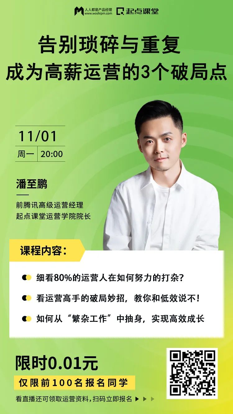 针对以上问题,我们特意请来拥有前腾讯高级产品运营、起点课堂运营学院院长@潘至鹏老师,在 11月1日(周一)晚8点 专门为正在“打杂”的运营人进行分享!