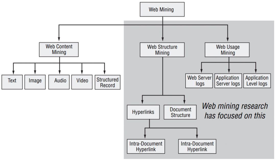 直接解决方案就是使用 Web 挖掘工具 。Web 挖掘是应用数据挖掘技术,从 Web 数据中提取知识。这个 web 数据可以是 Web 文档,文档之间的超链接和/或网站的使用日志等。根据要挖掘的数据大致可以分为三类