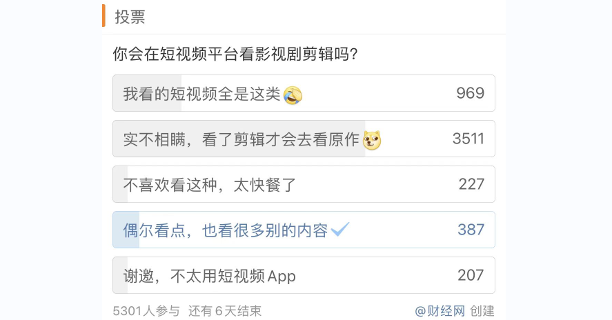 该得票结果反映了一个现实问题:在短视频平台上看影视剪辑内容,已成为部分用户筛选影视内容的主要方式之一。