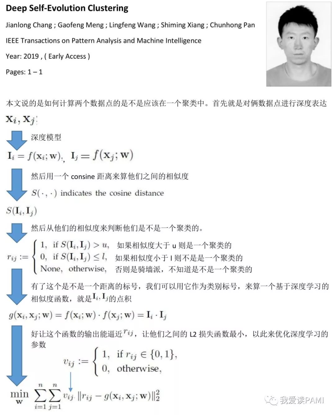 本文说的是聚类,但是转化成了相似度对比的问题。首先就是用个深度模型来判断是不是相似,而模型学习的标号又是通过相似度加俩阈值得到的,最终通过一起来学习模型参数和阈值而进行聚类。作者是自动化所的大神Jianlong Chang。