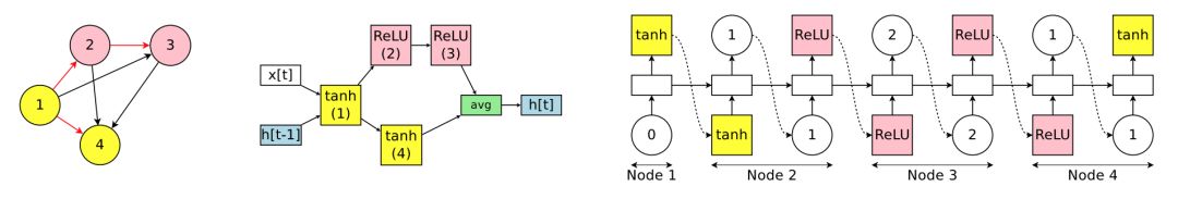 图 1:搜索空间中带有四个计算节点的循环单元案例。左图为对应循环单元的计算 DAG,其中红色的边代表图中的信息流。中间为循环单元。右图为 RNN 控制器的输出结果,它将会生成中间的循环单元和左边的 DAG。注意节点 3 和 4 永远不会被 RNN 采样,所以它们结果是平均值,且可以作为单元的输出。