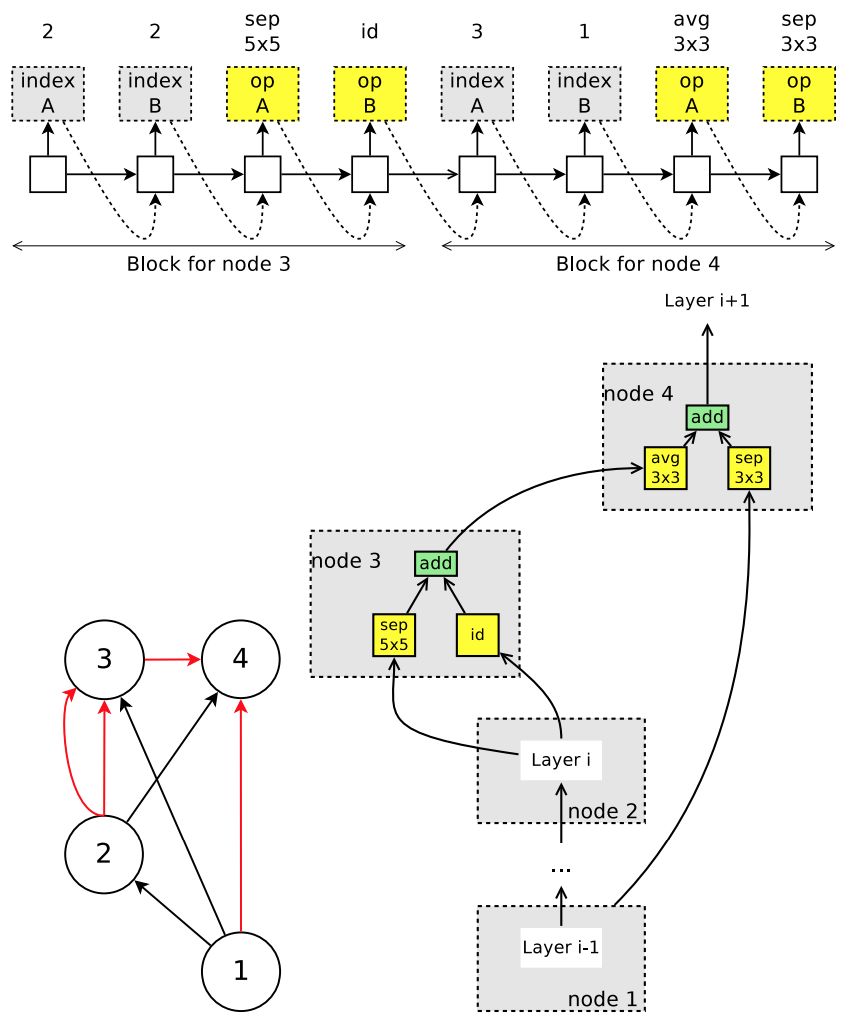 图 5:控制器在卷积单元搜索空间中运行的示例。上:控制器的输出。在卷积单元的搜索空间中,节点 1 和节点 2 是单元的输入,因此控制器只需要设计节点 3 和节点 4。左下:对应的 DAG,其中红边代表激活的连接。右下:由控制器采样得到的卷积单元。