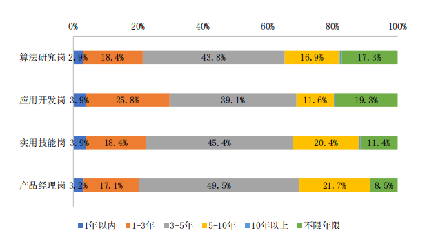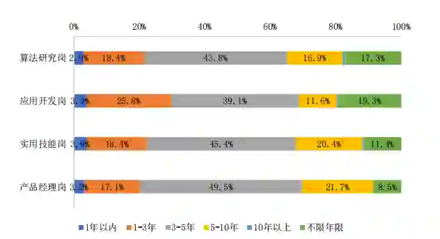 算法研究岗和应用开发岗的学历准入门槛远高于其他岗位,45.1% 的算法研究岗和 41.9% 的应用开发岗要求应聘人员具有硕士及以上学历;实用技能岗和产品经理岗的准入门槛为本科及以上,相关的岗位占比分别为 88.8% 和 91.8%。另外,当前 6.9% 的实用技能岗允许专科 学历人才进入,这是由于实用技能岗普遍以计算机相关技能型人才为主, 这一比重均高于其他岗位。