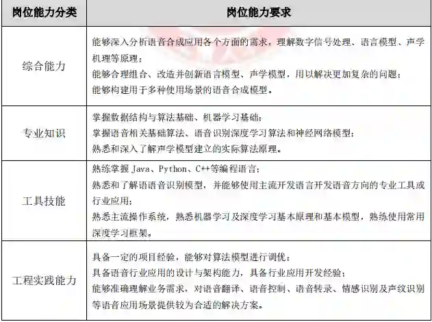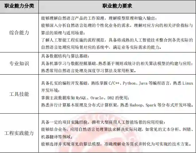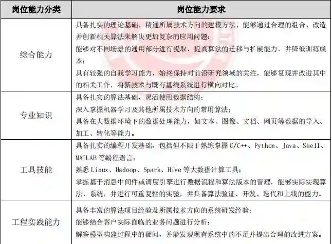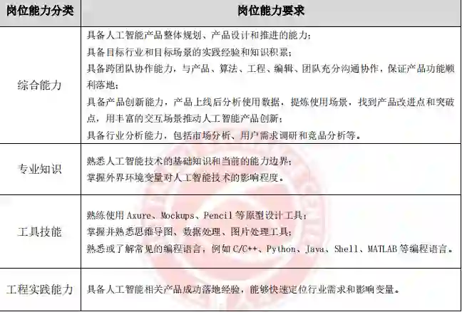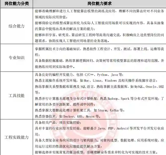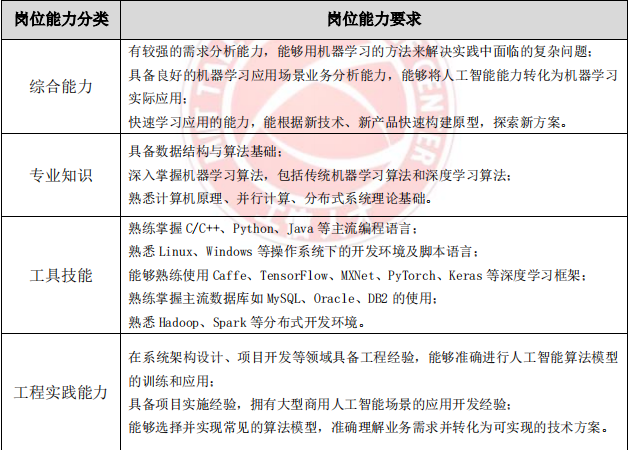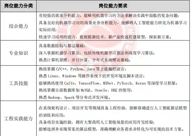 算法研究岗、应用开发岗、实用技能岗和产品经理岗在实践中的工作重点不同,企业对各典型岗位的职业能力要求也存在较大差异。