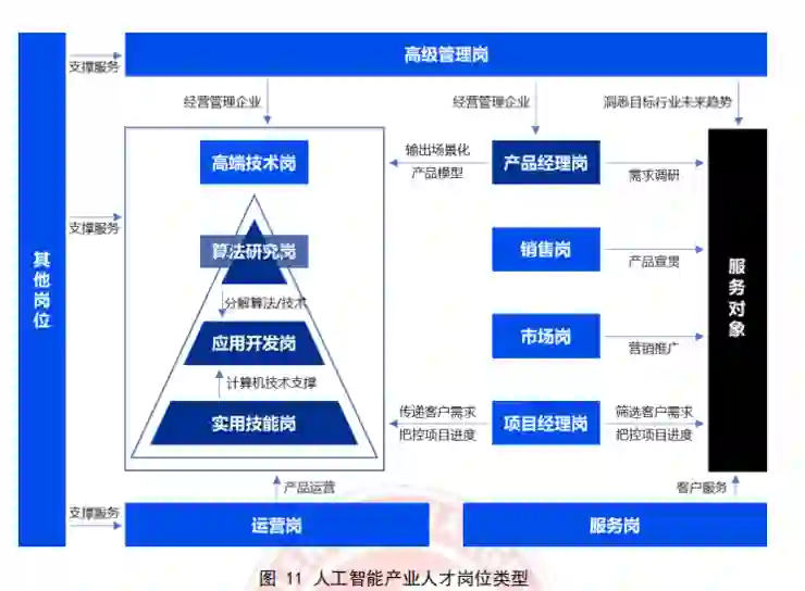 根据各人工智能企业岗位人才需求,可归纳为高级管理岗、高端技术岗、算法研究岗、 应用开发岗、实际技能岗、产品经理岗等类型岗位。