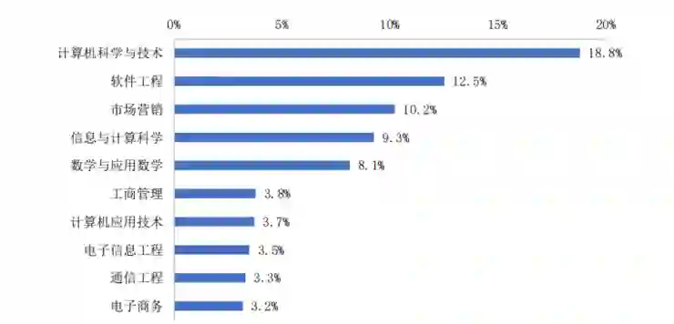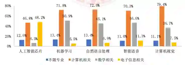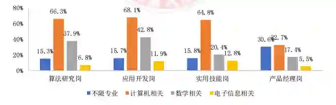 各典型岗位专业要求中,大多寻求计算机相关专业的人才,其中 60%以上的算法研究岗、 应用开发岗和实用技能岗均要求计算机相关专业。