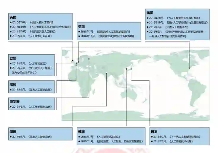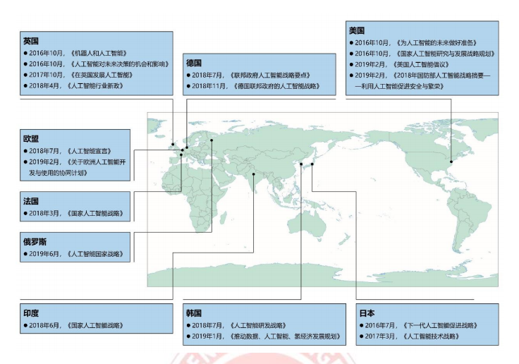 当前人工智能已经成为各国创新技术竞争的焦点领域,包括中国在内的全球诸多国家将 人工智能列入国家科技战略部署序列。中国、美国、欧盟、英国、德国、俄罗斯、日本、韩 国、印度等主要国家在 2016 年至 2019 年间密集发布人工智能专项政策及行动规划,引导、 推动人工智能产业的发展已成为全球经济共同体的重要共识。