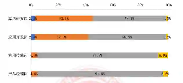 除外,算法研究岗、应用开发岗对数学相 关专业的需求程度也更高,其中 37.9% 的算法研究岗和 42.8%的应用开发岗要求具有数学相 关专业背景。相比而言,产品经理岗位专业要求限制较少,30.6% 的产品经理岗无专业限制。