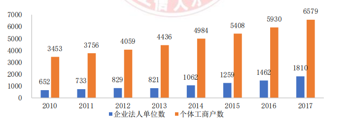 2017 年中国企业法人单位为 1809.77 万个,而个体工商户总数更是达到了 6579. 37 万户。另外,2018 年中国人口总数达到 13.9538 亿人,其中互联网上网人数已经达到 8. 2851 亿人。人工智能技术作为实践数字经济的重要构成和基石,逐步与互联网时代的社交 电商服务、共享经济服务、网络直播服务和互联网金融服务等融合,探索出新型应用模式。
