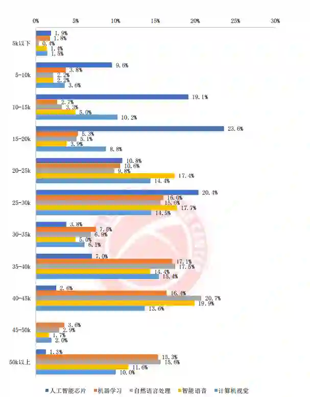 当前人工智能芯片相关岗位的单月薪酬水平相对较低,单月薪酬 30K 以内的岗位占比高达 85.4%;机器学习、自然语言处理、智能语音和计算机视觉相关岗位的单月薪酬水平明显较高,主要集中在 35K 以上薪酬区间段。另外,机器学习和自然语言处理相关岗位在 50k 以上的超高薪酬区间段上的聚集程度均高于智能语音和计算机视觉相关岗位。