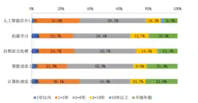 3 至 5 年的工作经验是当前各个典型技术方向对人才的普遍要求。此外,人工智能芯片和计算机视觉相对来说更能接受“年轻化”的人才,33.2% 的人工智能芯片相关岗位和 32.9% 的计算机视觉相关岗位对工作年限没有过高的要求,可接纳工作 3 年以下的人才。自然语言处理技术方向更希望寻求工作年限较长的人才,近 15% 的自然语言处理相关岗位寻求工作 5 年以上的人才。