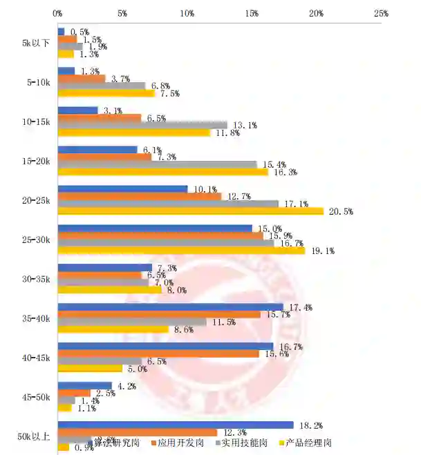 目前高达 56.5% 的算法研究岗和 46.1%的应用开发岗的单月薪酬达到 35k 以上,实用技能岗和产品经理 岗的单月薪酬普遍集中于 30k 以下,20-30k 是目前主要的薪酬区间段,相关的岗位占比分 别为 33.8%和 39.6%。