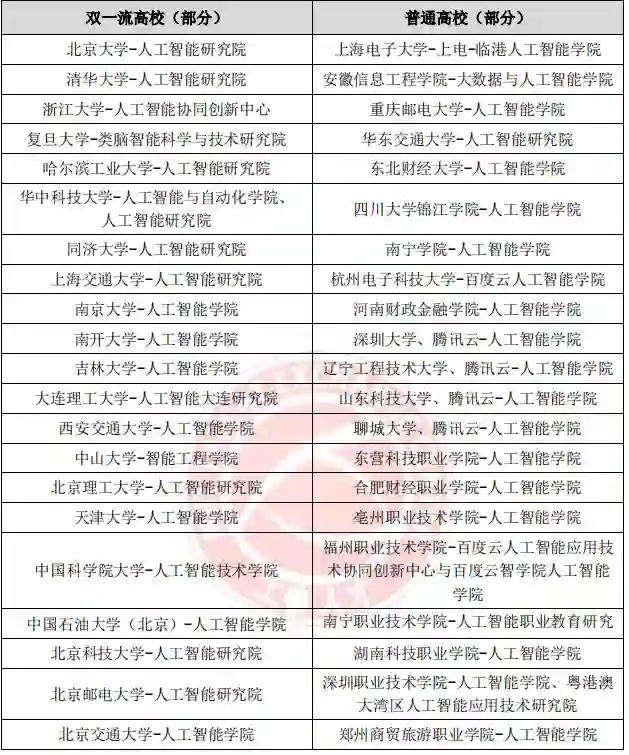 除设立人工智能专业外,同期国内各类型高校已经着手建立人工智能学院、人工智能研究院, 国内顶尖高校如北京大学、清华大学、浙江大学、复旦大学等,成立人工智能教学与研究机构,主攻人工智能基础研究,包括数理基础、认知科学基础、智能感知、机器学习、类脑计算、人工智能治理以及智能医疗、智能社会等方面,旨在培养并输出具备人工智能基础研究 能力的研究型人才。