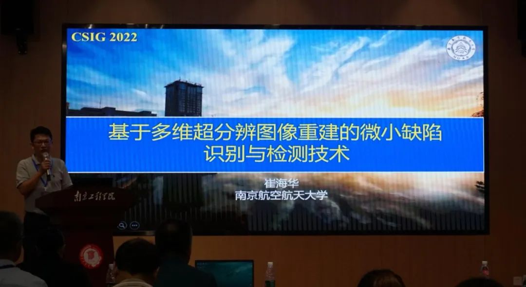 南京航空航天大学崔海华教授的报告“基于多维超分辨图像重建的微小缺陷识别与检测技术”,主要阐述了数字化成像过程中量化层面的不足,计算其表面纹理和法向信息进行高对比显示,凸显图像轮廓特征,解决图像细小特征对比度低,易受二维歧义性干扰的短板;针对图像数字化过程中采样分辨率层面的不足、图像描述子离散的问题,引入图像超分重建解决因硬件瓶颈而导致的细节不足。通过量化、采集等多维度的图像再重建,实现微小缺陷超分辨增强等。