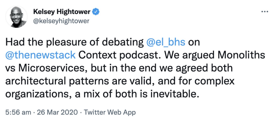 分解单体应用也是如此。我最喜欢的 Kelsey Hightower 的一条推文是这样写的:
