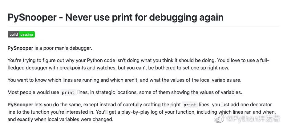 其实 PySnooper 的作用有点类似,你不用小心谨慎地用 print 输出语句,只需在想调试的函数中引入一个装饰器。然后得到函数的详细日志,包括运行了哪些行、何时运行,以及何时更改了局部变量。