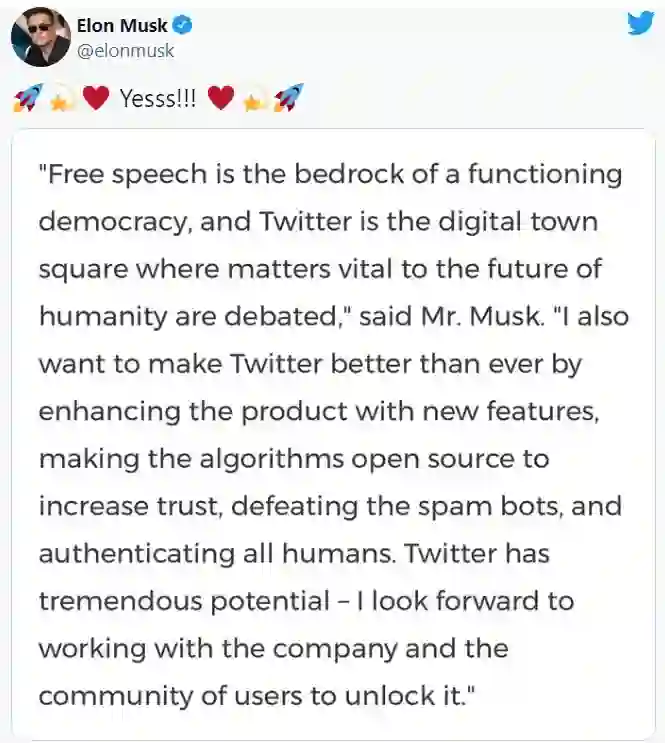 经过了几周的酝酿,深思熟虑后,推特公司董事会于当地时间4月25日公开一致接受了440亿美元的收购要约。