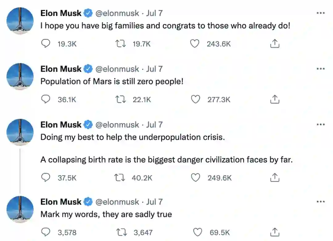 在与36岁Neuralink女高管秘密产下双胞胎事情被曝光后,马斯克连续发了几条推文表示,