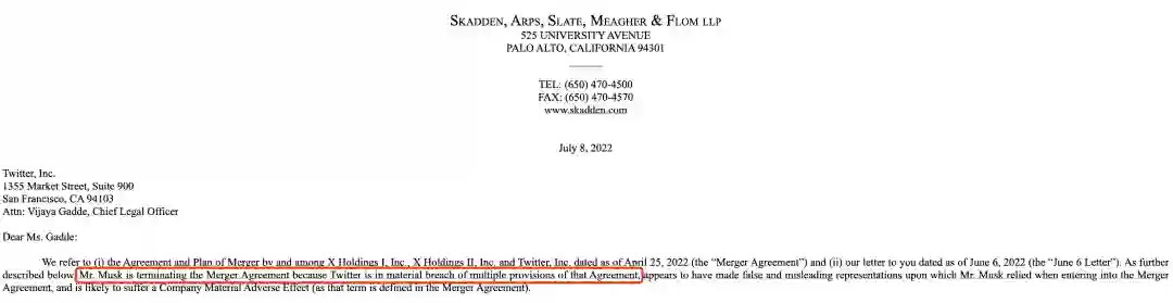 根据昨日晚间披露的一份监管文件,代表马斯克的一名律师在给推特的高级律师的信中声称,马斯克打算要终止这笔交易,因为