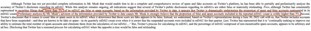 文件中提到,「近两个月来,马斯克先生一直在寻求必要的数据和信息,以对推特平台上的虚假或垃圾账户的普遍性进行独立评估,这些信息对推特的业务和财务表现至关重要,是完成并购协议所设想的交易的必要条件。」