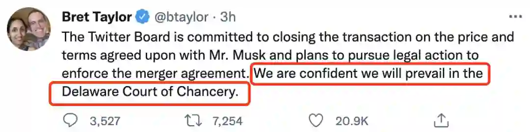 「推特董事会致力于按照与马斯克先生商定的价格和条款完成交易,并计划采取法律行动来执行合并协议。我们相信我们将在特拉华州大法官法庭上获胜。」