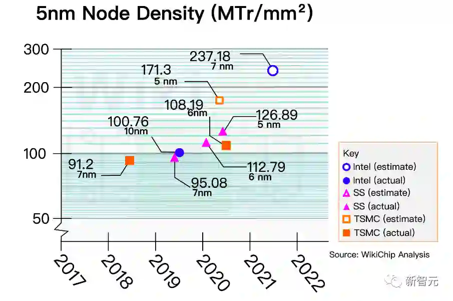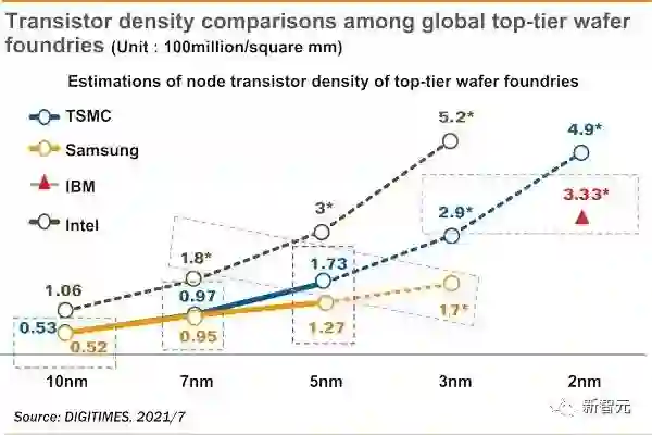 去年,Digitimes表明,三星3nm工艺可达成的晶体管密度大约为170 MTr/mm²(百万晶体管每平方毫米);而台积电早在5nm时代就已经将晶体管密度推进到了173 MTr/mm²。