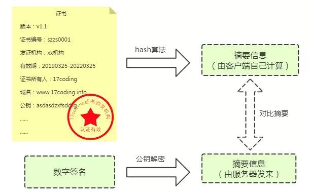 服务器在与客户端通信的时候,就会将数字证书和数字签名出示给客户端了。客户端拿到数字证书和数字签名后,先通过操作系统或者浏览器内置信任的CA机构找到对应CA机构的公钥对数字签名进行解密,然后采用同样的摘要算法计算数字证书的摘要,如果自己计算的摘要与服务器发来的摘要一致,则证书是没有被篡改过的!这样就防止了篡改!第三方拿不到CA机构的私钥,也就无法对摘要进行加密,如果是第三方伪造的签名自然也在客户端也就无法解密,这就防止了伪造!所以数字签名就是通过这种机制来保证数字证书被篡改和被伪造。具体流程如下: