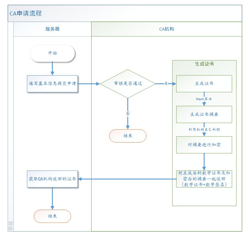 服务器提交自己的基本信息想CA机构提出申请,CA机构在给服务器颁发证书的时候,会连同数字证书以及根据证书计算的摘要一同发送给服务器,且这个摘要是需要经过CA机构自己的私钥进行加密的。申请流程如下: