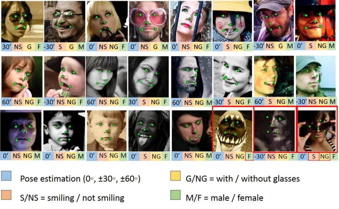 This dataset contains 12,995 face images collected from the Internet. The images are annotated with (1) five facial landmarks, (2) attributes of gender, smiling, wearing glasses, and head pose.