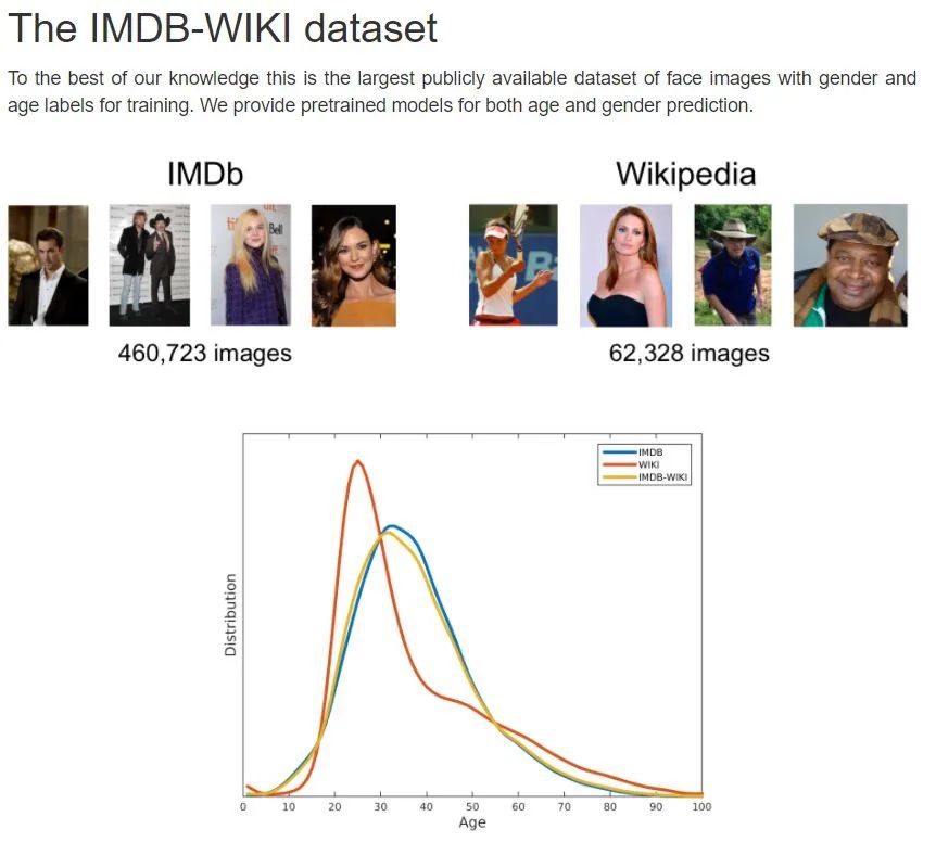 IMDB-WIKI人脸数据库是有IMDB数据库和Wikipedia数据库组成,其中IMDB人脸数据库包含了460,723张人脸图片,而Wikipedia人脸数据库包含了62,328张人脸数据库,总共523,051张人脸数据库,IMDB-WIKI人脸数据库中的每张图片都被标注了人的年龄和性别,对于年龄识别和性别识别的研究有着重要的意义。