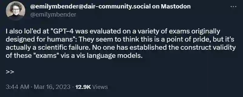 与此同时,一些研究者、从业者也表示,GPT-4 可能并没有 OpenAI 所展示的那么强大,尤其是在编程方面:它可能只是记住了之前的题目,OpenAI 用来测试该模型编程能力的题目可能早就存在于它的训练集中,这违反了机器学习的基本规则。另外,还有人指出,看到 GPT-4 在各种考试中名列前茅就判定 AI 将取代部分职业的想法是不严谨的,毕竟这些考试和人类的实际工作还是有差距的。