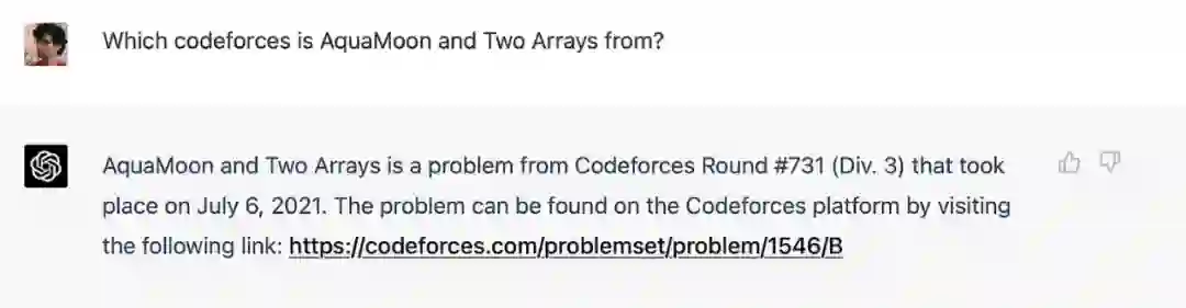 作者表示,事实上,他们可以明确地表明 GPT-4 已经记住了训练集中的问题:当把 Codeforces 问题的标题加入 prompt 中时,GPT-4 的回答会包含指向出现该问题的确切比赛的链接(并且轮数几乎是正确的:它差了一个)。注意,当时的 GPT-4 不能上网,所以记忆是唯一的解释。