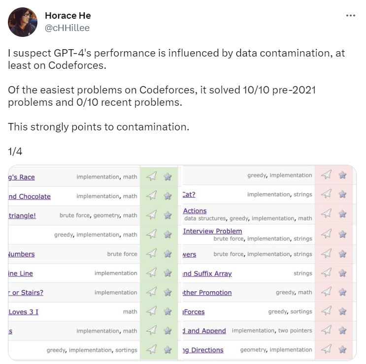 ▲ GPT-4记住了训练截止日期之前的Codeforces问题