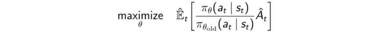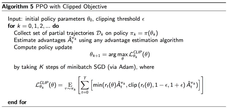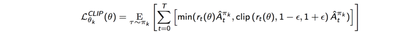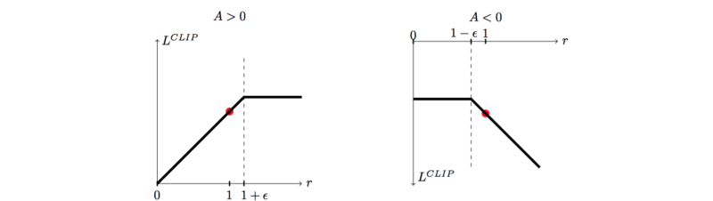 如果新策略和旧策略之间的概率比落在区间 (1- ε)和 (1 + ε)外面,那么优势函数就会被剪贴。对于在PPO论文中(详见贡献和参考之中)的实验,ε设定为0.2。