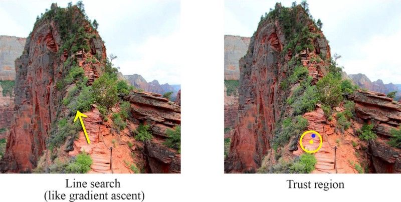 在梯度上升法中,我们判断最陡峭的方向,之后朝着那个方向前进。但是如果学习率(learning rate)太高的话,这样的行动也许让我们远离真正的回报函数( the real reward function ),甚至会变成灾难。