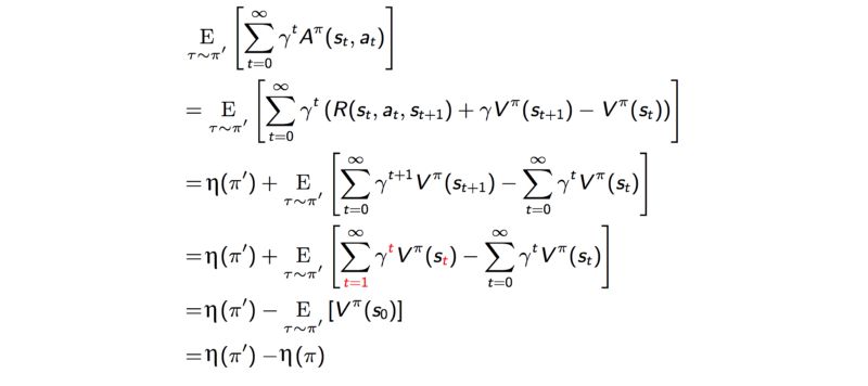 自然策略梯度的关键思想是保证了函数单调上升。它是Policy Gradient方法家族中的“用货币担保”的版本(笑)。简而言之,至少在理论上,任何策略策更新都将比之前的好。我们在这需要证明的是,基于优化M的新策略 可以保证在 η (实际预期回报)方面的表现优于之前的策略。由于策略的数量是有限的,持续更新策略最终能达到局部或全局最优。这是证明: