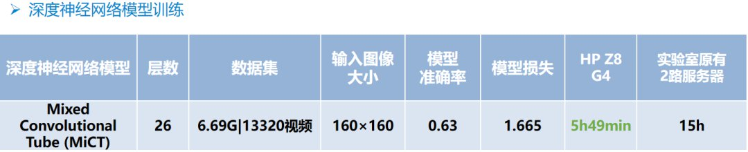 在行为识别任务上,基于 MiCT 对视频中的行为进行识别实验中,原本耗时为 15h 的训练,使用 HP Z8 G4 仅需要 5h49min,节省了将近三分之二的时间。