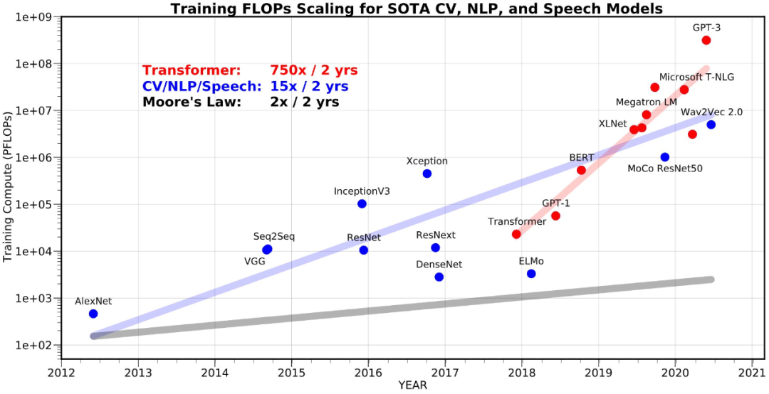这些只是单纯的算力需求,还不论训练 SOTA 模型的新挑战——对于 NLP 和推荐系统模型来说,内存和芯片内 / 芯片间的通信正在成为又一个瓶颈。